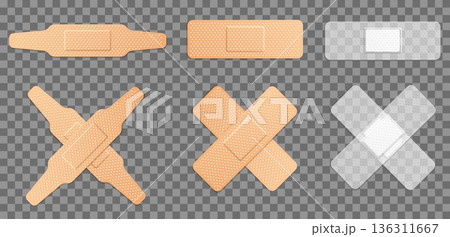 Realistic transparent and flesh colored medical plasters stuck crosswise. Perforated pharmaceutical bands. Wounds protection. Injury bandages. Vector antibacterial sticker tapes set