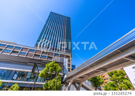 日本の東京都市景観 京浜東北・根岸線(先頭車両)などを望む。奥にベースゲート横浜関内タワー