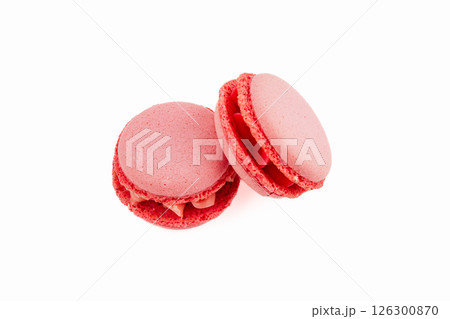 Delicate red macarons with creamy filling on white background