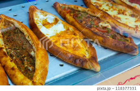 Traditional Turkish pide with various fillings on bakery showcase