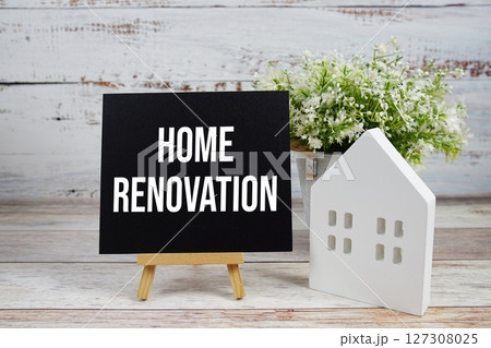 Home Renovation on paper card with white house model on wooden background