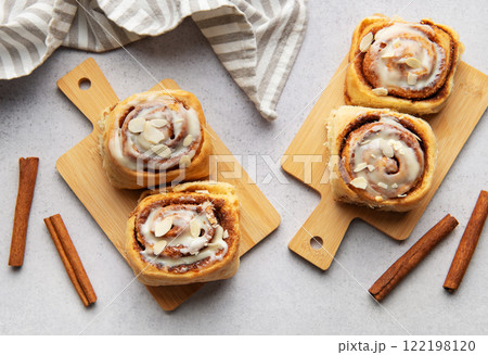 Delicious cinnamon rolls topped with icing and almonds on wooden cutting boards
