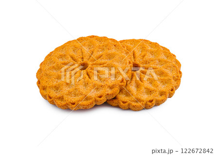Golden brown round cookie with a textured surface sitting on a clean white background during daylight