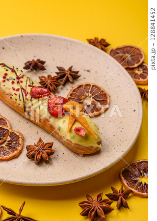French food, dessert eclair with chocolate filling. Eclair as a background