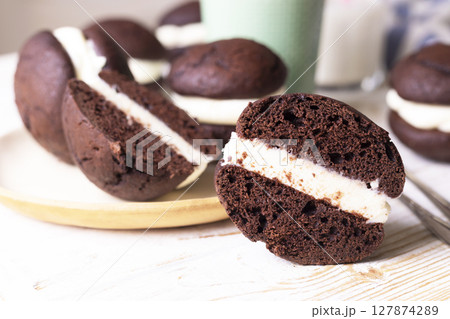Delicious cream-filled pastries displayed on a wooden board for a tempting dessert experience