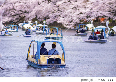 桜が満開の井の頭池の風景・ボートに乗ってお花見する人々