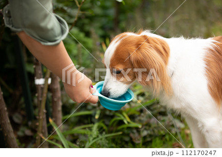 ハンディウォーターボトルで犬(ペット)に水をあげる飼い主