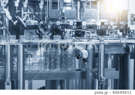 The empty water bottles on the conveyor belt for filling process in the filling machine.