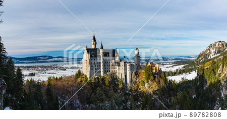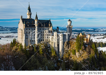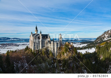 ドイツ ノイシュヴァンシュタイン城の後ろに広がる雪化粧の山とペラート峡谷