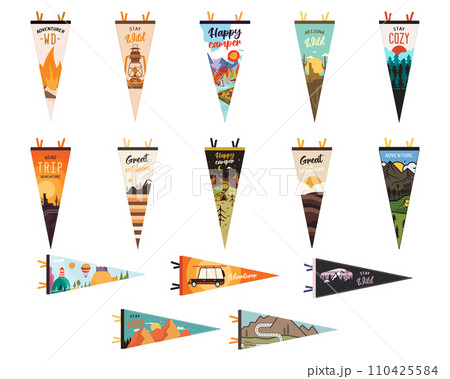 Set of adventure pennants. Camping Pennant flags design. Vintage outdoor designs with summer camp symbols mountains, lantern, campfire. Stock collection