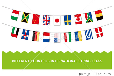 世界のさまざまな国旗バナー、連なった国旗のガーランドの主線ありのイラストセット。