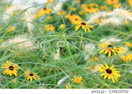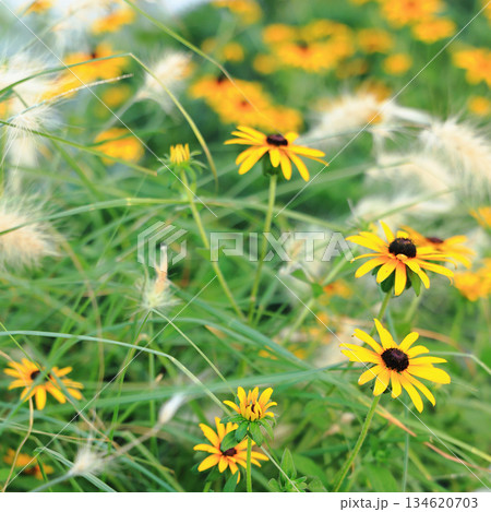 かわいい黄色い花を咲かせるルドベキアが満開のガーデン、角型の背景