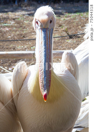 モモイロペリカンの正面顔アップ鳥類動物園写真