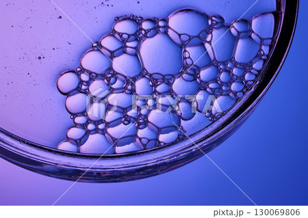 Bubbles in shampoo or shower gel. Texture on a purple background.