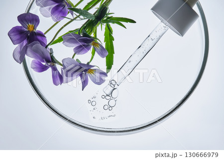 Pansies are lying next to a cosmetic pipette with serum in a petri dish.