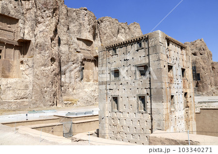 Royal tombs and Cube of Zoroaster (Ka'ba-ye Zartosht ) in ancient necropolis Naqsh-e Rustam, Achaemenid dynasty, Fars province, Iran. UNESCO world heritage site