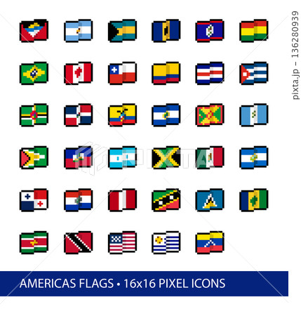 Americas Flags Pixel Art Vector Icons 16x16. Set of 30+ stylized, simplified, abstract pixel interpretations of flag designs in common use as of 2026.