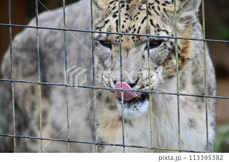 鼻を舐めるユキヒョウの顔のアップ 多摩動物公園 東京都日野市