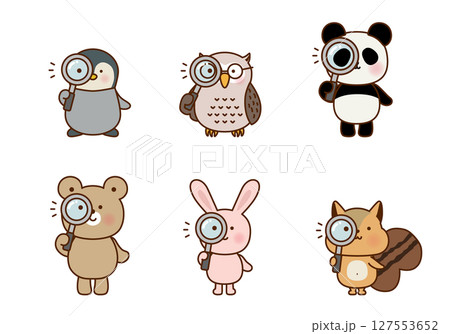 虫眼鏡を持つかわいい動物たちの観察イラストセット