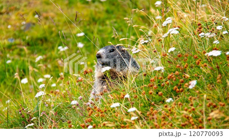 リッフェルベルグお花畑のマーモット スイス ツェルマット
