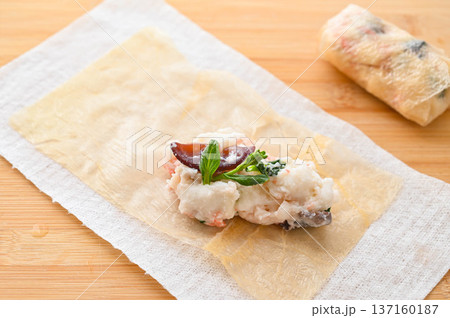戻した乾燥湯葉に具材をのせる