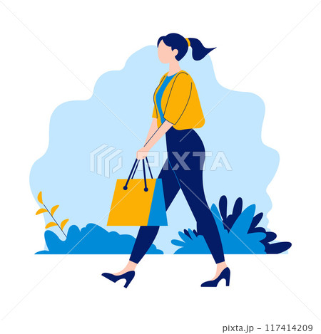 Flat Design Illustration of Beautiful Woman Walking in the Park While Holding Shopping Paper Bag