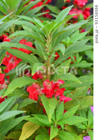 雨あがりの赤いホウセンカの花(雨滴のついた花壇の鳳仙花)