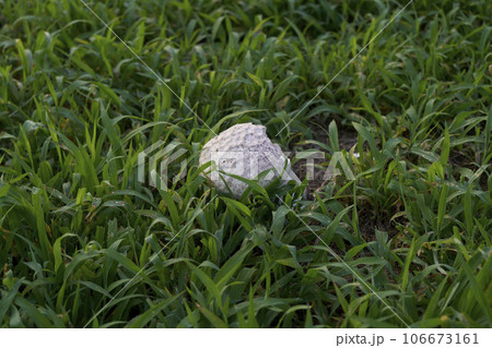 白いキノコとの比較するためのスコップに割り込んだカエル