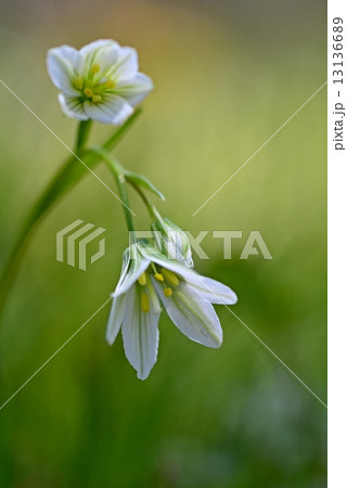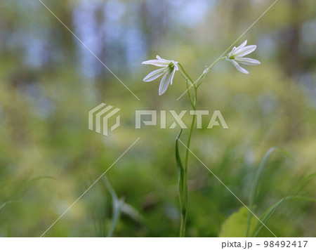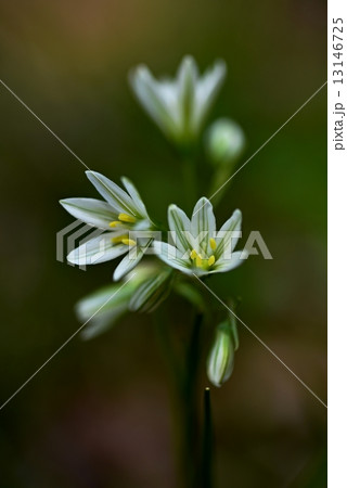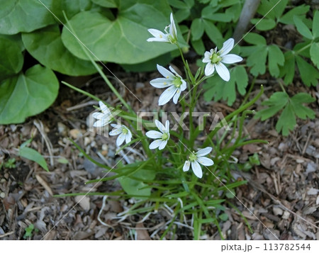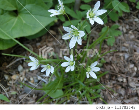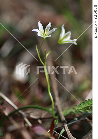 真上から見た春に咲く白い花と蕾【ホソバノアマナ/ユリ科】長野県八千穂高原