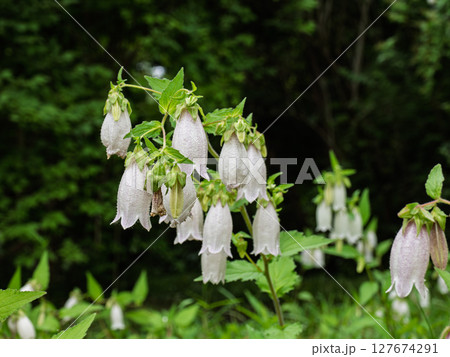 ホタルブクロ 山野草 白花 袋状の下向きの花 明るい背景