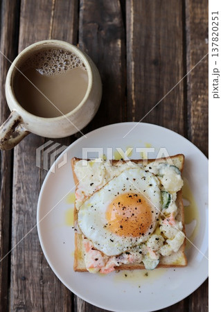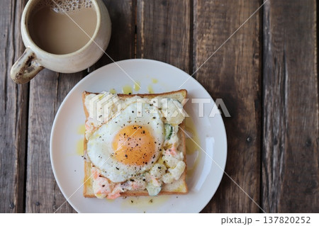 オリーブオイルをかけたポテトサラダと目玉焼きのオープンサンドとソイラテ
