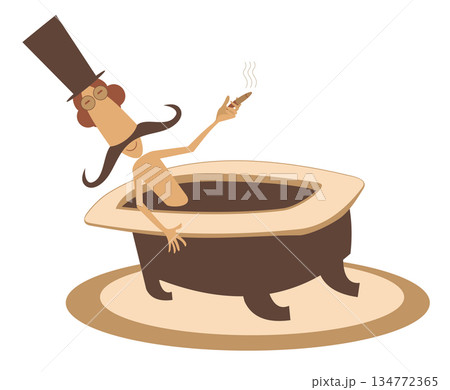 Cartoon long mustache man takes a bath and smokes a cigar. Comic long mustache man in the top hat lies in the bathtub and smokes a cigar