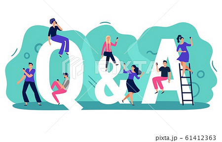 Questions and answers. Q_A with people, persons with smartphones ask question and find answer vector illustration. Young men and women searching for problem solution. Mobile q and a service