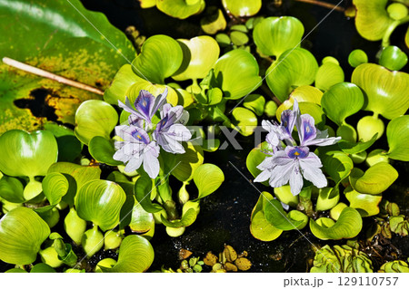 10月秋の池に咲く薄紫色のホテイアオイの花