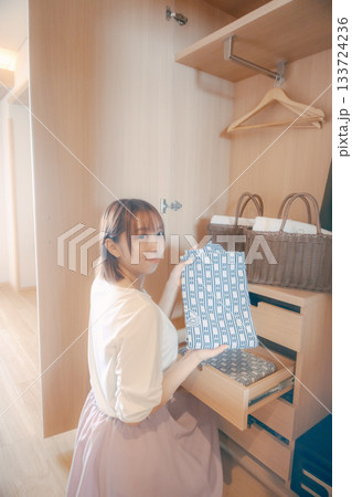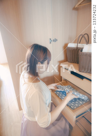 20代 女性がホテルの客室で浴衣を選ぶシーン