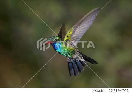 飛翔するアオボウシモリハチドリ