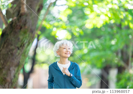 新緑の公園などでウォーキングやランニングなどの運動をする高齢のシニア女性 走る走る横顔