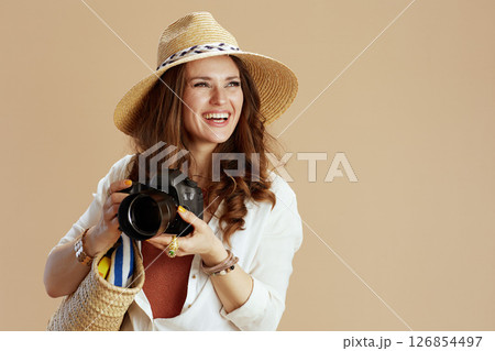 smiling elegant woman in blouse and shorts isolated on beige