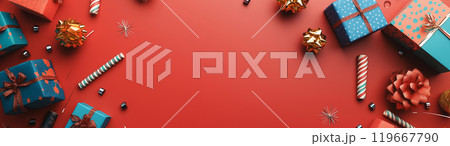 Red Christmas gift with a glittery ribbon surrounded by festive decorations. Perfect for holiday mockups.
