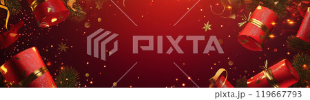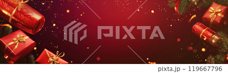 Flat lay of beautifully wrapped Christmas gifts with red and gold ribbons, pine branches and baubles on a wooden table