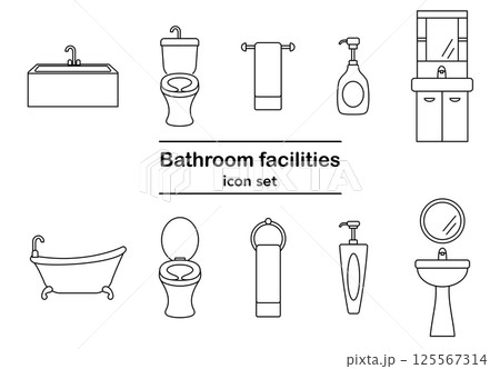 バスルーム設備のアイコンセット|バスタブ・トイレ・タオル掛け・洗面台・シャンプーボトル