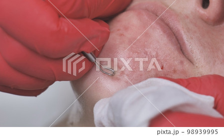 Squeezing acne from a girl with problem skin in the salon using a loop.