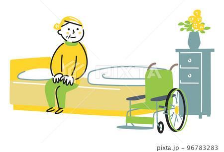 車椅子のある部屋のベッドにすわるお祖母ちゃん シニアライフ イラスト素材