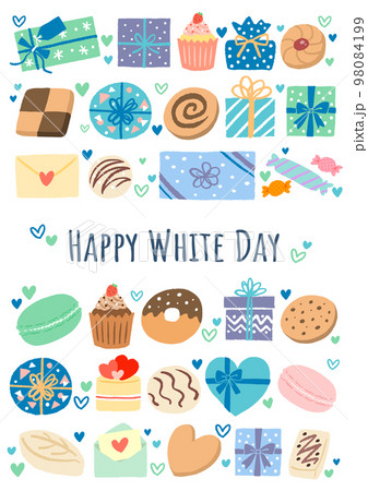 ホワイトデーのイラストセット。ロゴ、文字、フレーム、ベクター素材。