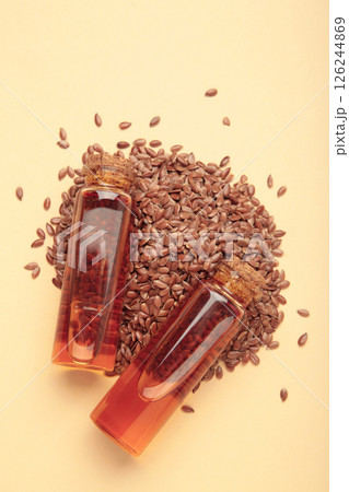 Flaxseeds with flaxseed oil in glass bottle on beige background.