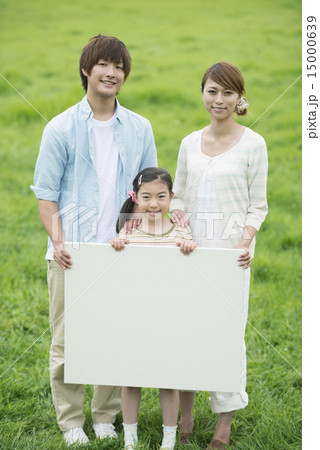 草原でメッセージボードを持ち微笑む家族
