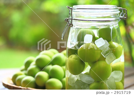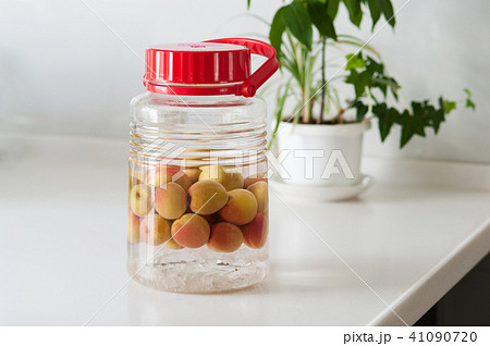 瓶に入った梅の実 手作り果実酒 青梅を漬ける作業 梅酒造り イメージ素材