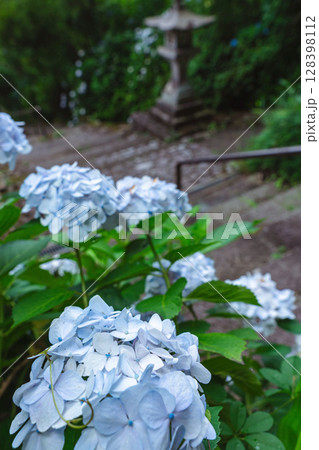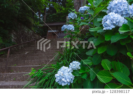 【備中国一宮】吉備津神社のアジサイ園に咲く青いアジサイの花と回廊3 岡山県岡山市北区