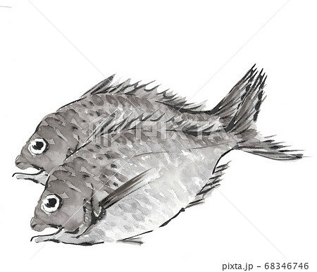 鯛 たい 2尾 ひば モノトーン 白背景【水墨画風】