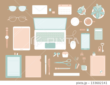 くすみカラーの俯瞰ビジネスデスクセット(背景色あり)/パステル文房具とPCのフラットレイ